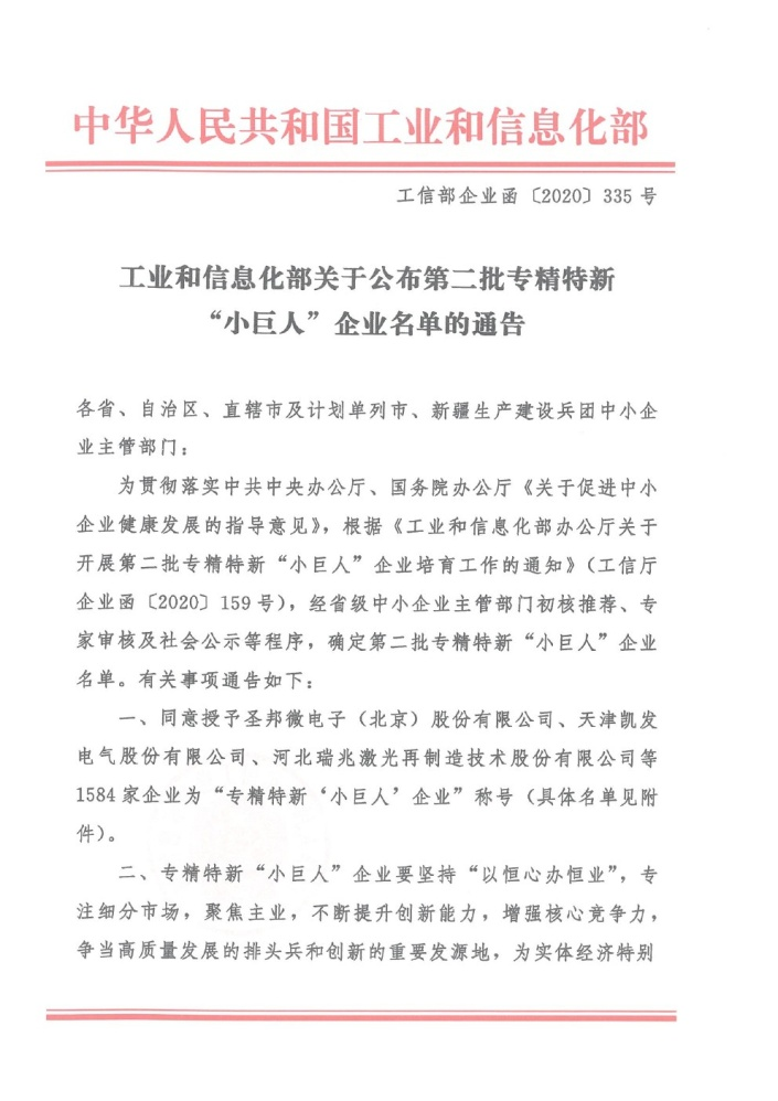 我公司被國家工業(yè)和信息化部認(rèn)定為第二批專精特新“小巨人”企業(yè)